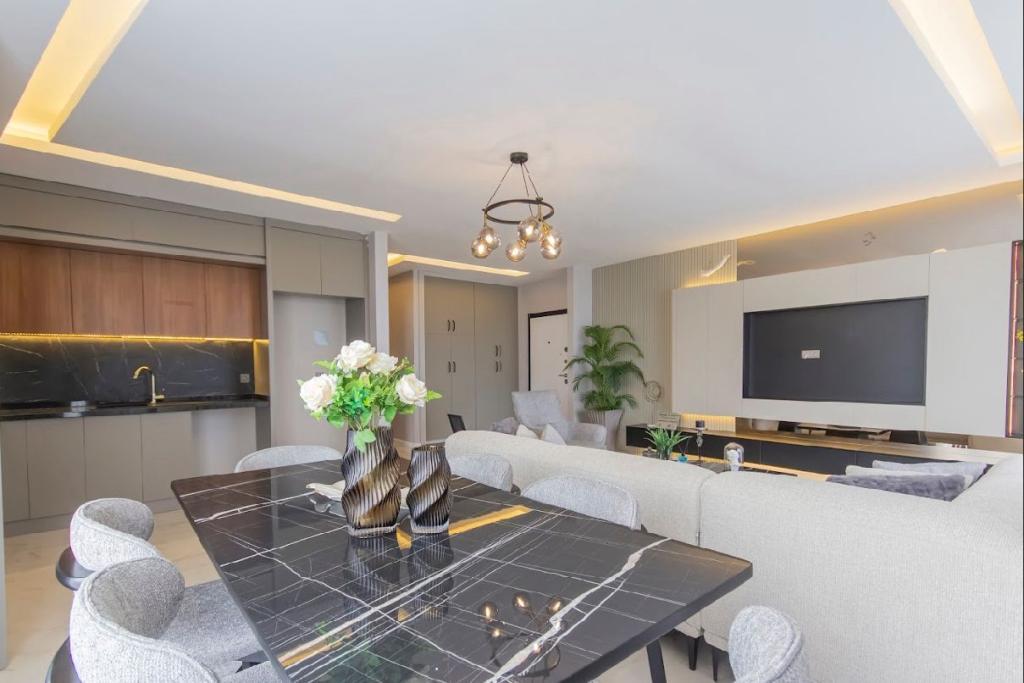 | Description: | Modern and spacious 3-room apartment on the 3rd floor, fully furnished with designer furniture and ready to move in. The apartment features two bathrooms, underfloor heating, and a large living room with a panoramic sea view. Total area 135 m². Ideal for both permanent living and investment. The complex has a large, well-maintained area with full infrastructure, including a sauna, café, outdoor pool, parking, and green social zones. Excellent location: 1,350 m to the sea, 1.5 km to Mahmutlar center, 20 km to Gazipaşa Airport, and 15 km to Alanya center. Nearby there are a market, pharmacy, transport stops, and all essential infrastructure. ID: 5040 |