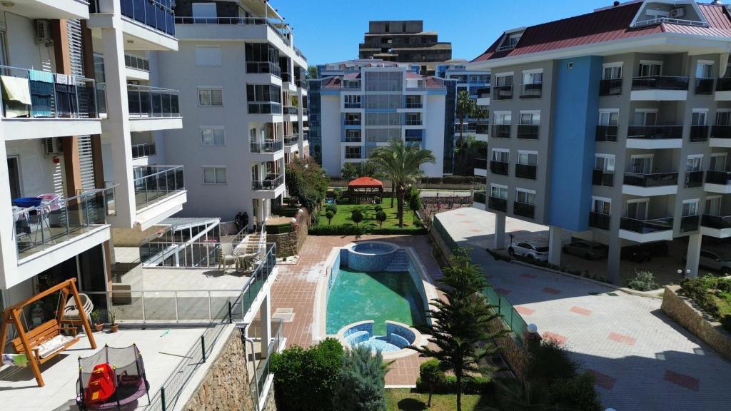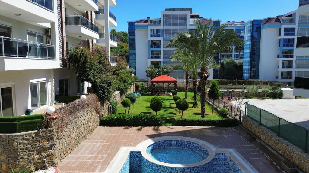 В жилом комплексе есть хамам, сауна и фитнес-зал. Также предусмотрены открытый и крытый бассейны, что позволяет пользоваться ими круглый год. На территории имеются парковка, детская игровая площадка, обслуживающий персонал, ухоженный сад и зона барбекю. Квартира предлагает комфортное проживание в спокойном и благоустроенном районе Кестель.